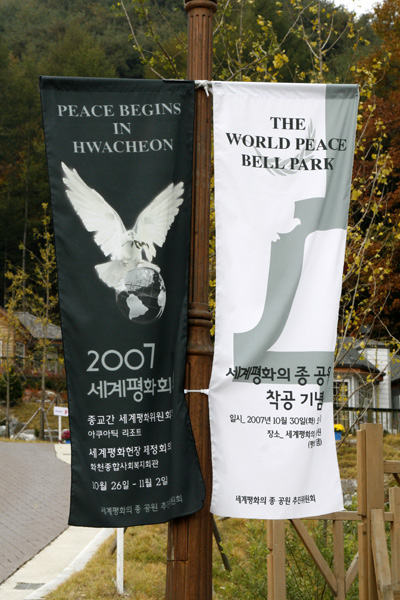 PEACE BEGINS IN HWACHEON; THE WORLD PEACE BELL PARK: flags bearing these words adorned lampposts at the site for the 10th Annual Meeting of the Peace Council, in Hwacheon County (Gangwon Province), South Korea, this past October 28-November 2, 2007. You might be surprised to hear that peace could begin in a small place you have probably never heard of, but Hwacheon is "a little place with a big vision," according to Daniel Gomez-Ibanez. Hwacheon County, in the northern part of South Korea, just below the DMZ, is an area which saw some of the most intense fighting of the Korean War, and people there have good reason to know the meaning and value of peace. Soldiers in camouflage uniforms are a frequent sight in the area, and on the roads you periodically see high stacks of huge concrete blocks poised to be toppled by explosives in order to impede an invasion from the North. The town (and county seat) of Hwacheon has 25,000 citizens, and there are 35,000 soldiers in the area.