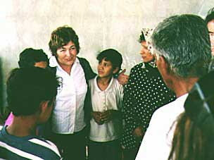 Abu-Faiz begin to rebuild as well when he was tossed out of the rented house he was living in. His lawyer agreed to admit the facts of the case in return for dropping the charges against a third son. However they didn't know that the Israeli Committee Against Home Demolitions and the Peace Council were going to bring international experts and Nobel Peace Prize laureate Mairead Maguire to the military court (in June, 2000) to prove that Abu-Faiz had no choice but to build "illegally." [The photo shows Máiread Maguire with Abu Faiz and his family in June, 2000.]